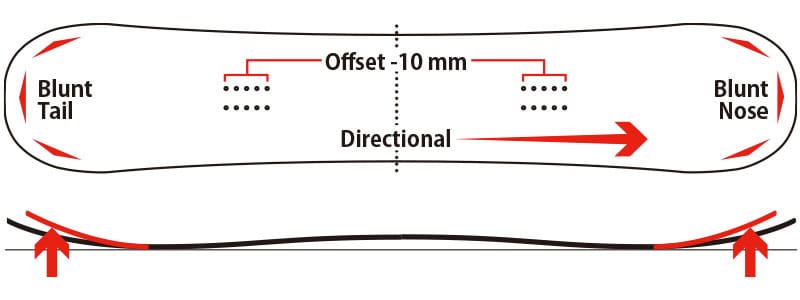 ディレクショナルツイン形状を採用。テールよりもノーズが長く設定され、インサートがセットバックされている。